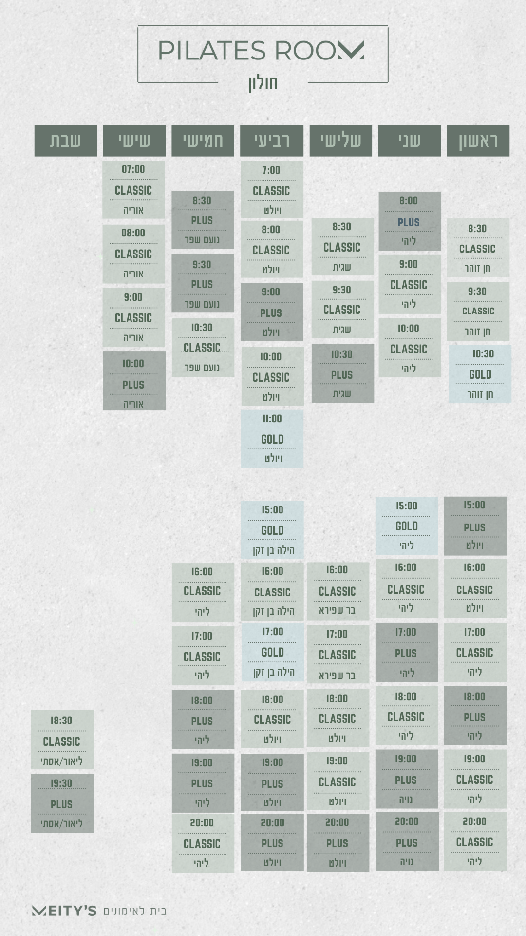 הסניף מציע Pilates Room מוקפד, עם פילאטיס מכשירים לכל הרמות, בסטנדרט גבוה וללא פשרות.